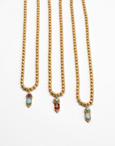 El colgante, elaborado de forma artesanal, incorpora una piedra semipreciosa natural cuidadosamente seleccionada. Cada variante presenta una combinación única de color y energía, lo que hace que cada collar tenga su propio carácter.