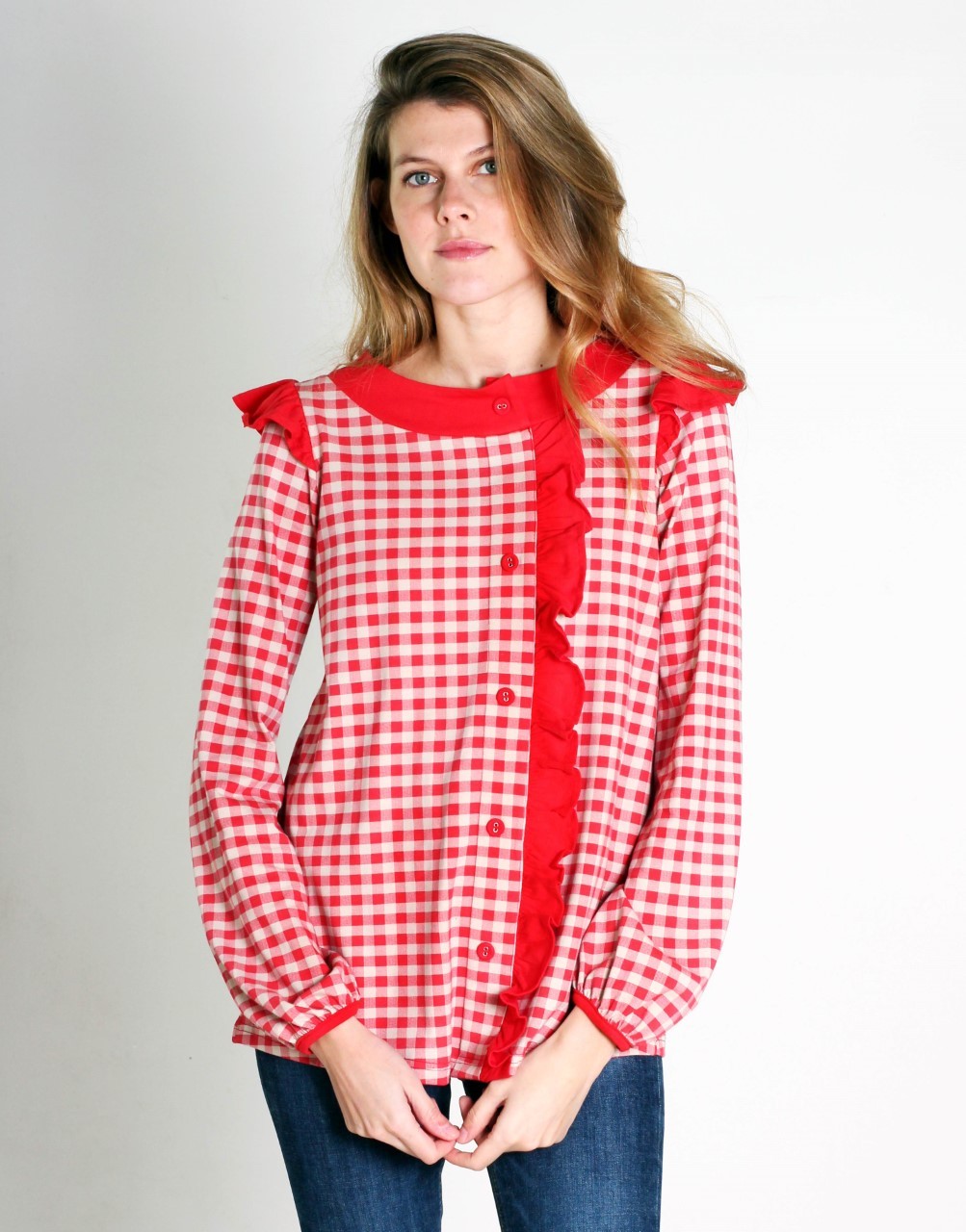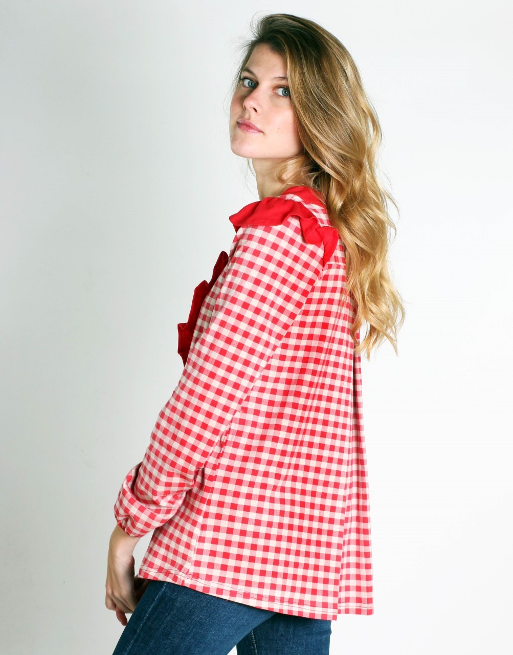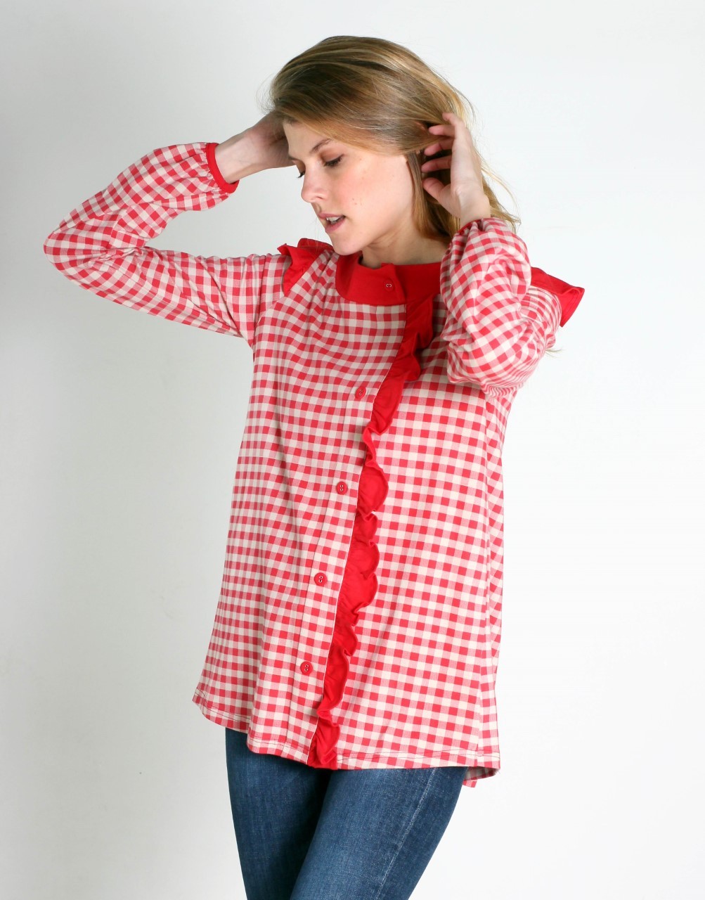Camiseta estampada con pequeños cuadros rojos sobre fondo beige. Lleva una tirilla ancha en el cuello redondo y un volante en el delantero en tono rojo liso. Y alitas sobre las mangas. En la parte trasera lleva canesú del cual se abre una pequeña pinza que aporta amplitud y movimiento.
