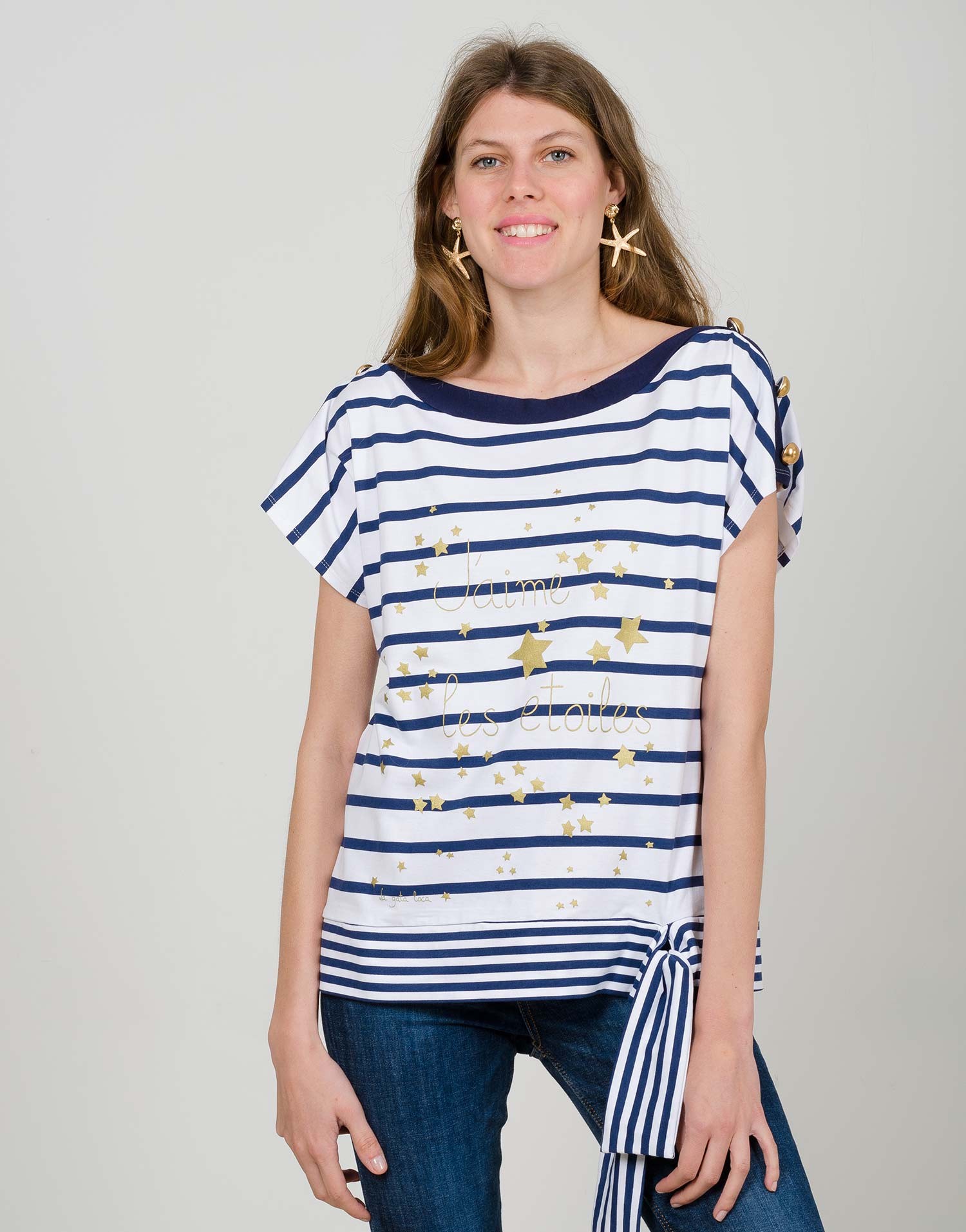 Jáime les etoiles, et toi? Nos encanta esta blusa marinera atemporal, con estampado de estrellas y botones en dorado. Glamourosa  y marinera toujours!