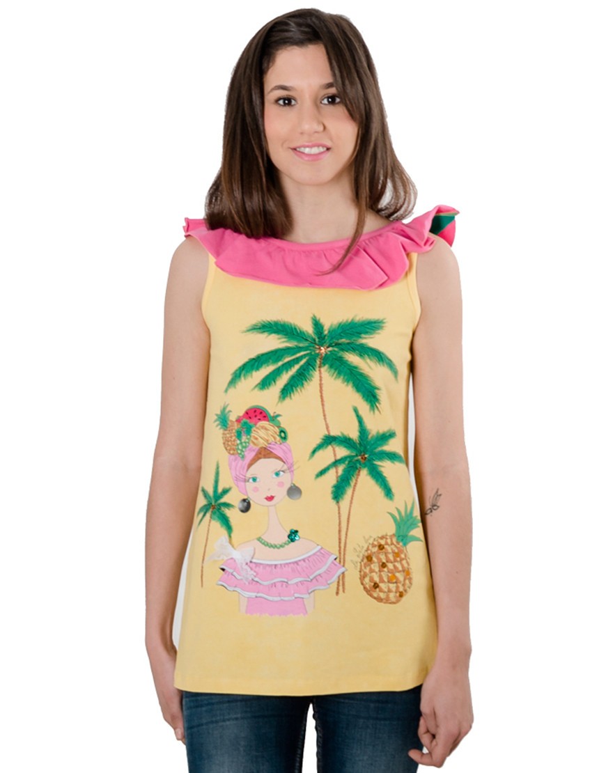Prenda alegre con ilustración tropical de chica cubana, frutas y palmeras. Combina colores cálidos y caribeños. La espalda tiene escote en pico, rematado con doble volante.