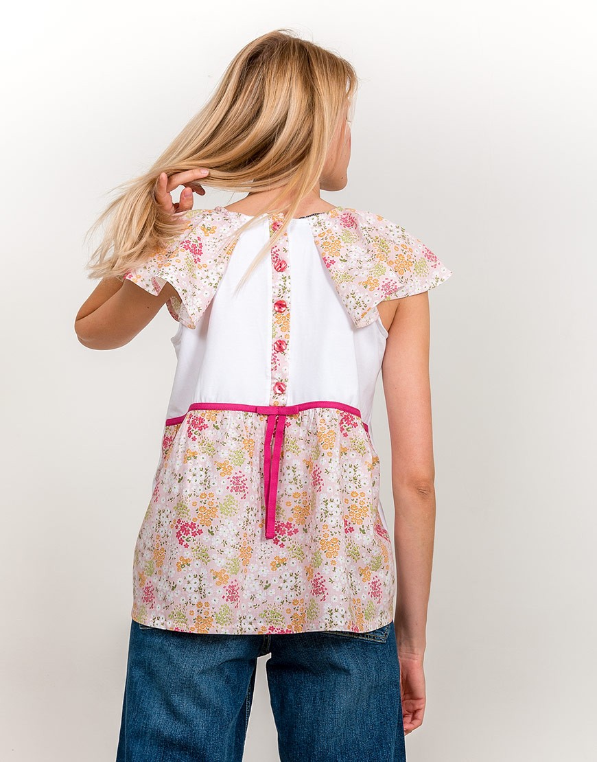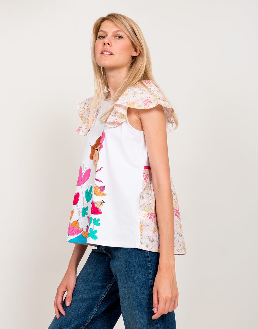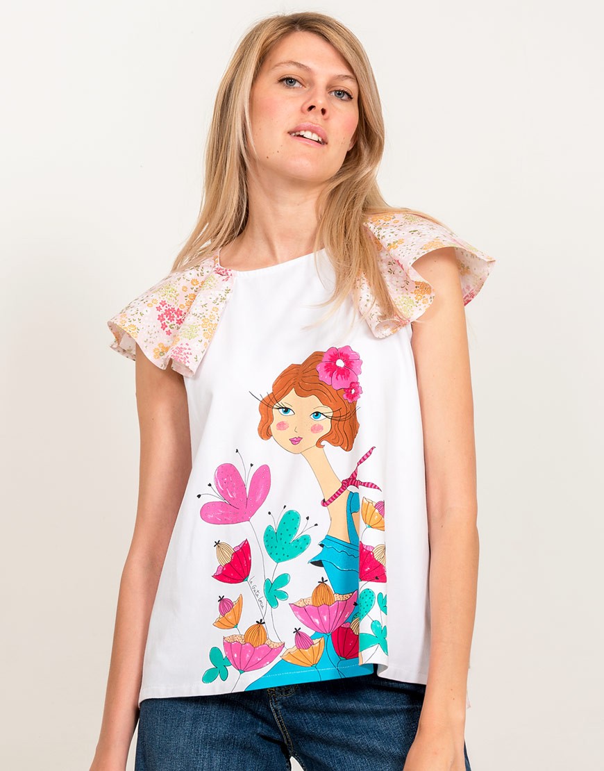 Preciosa camiseta con una de nuestras «pizpiretas» entre flores primaverales sobre fondo blanco. Elige esta blusa original si te has enamorado de ella como nosotras.