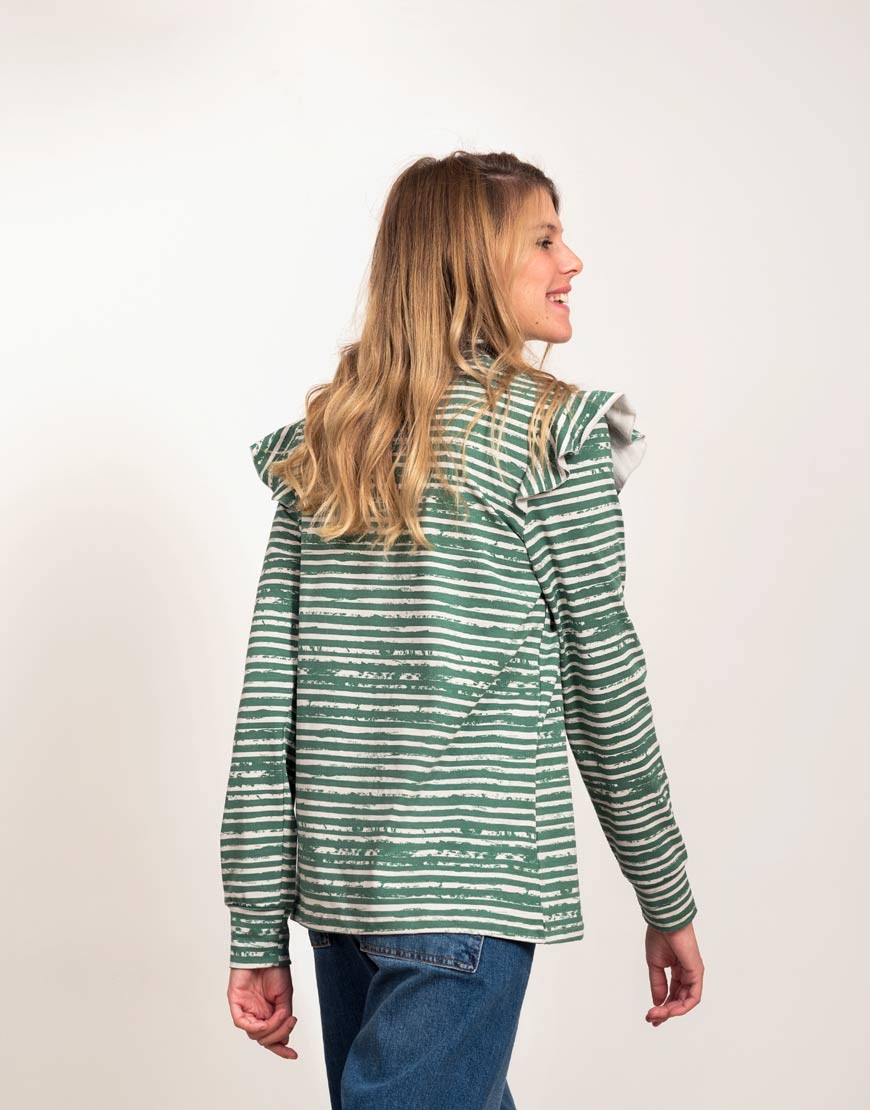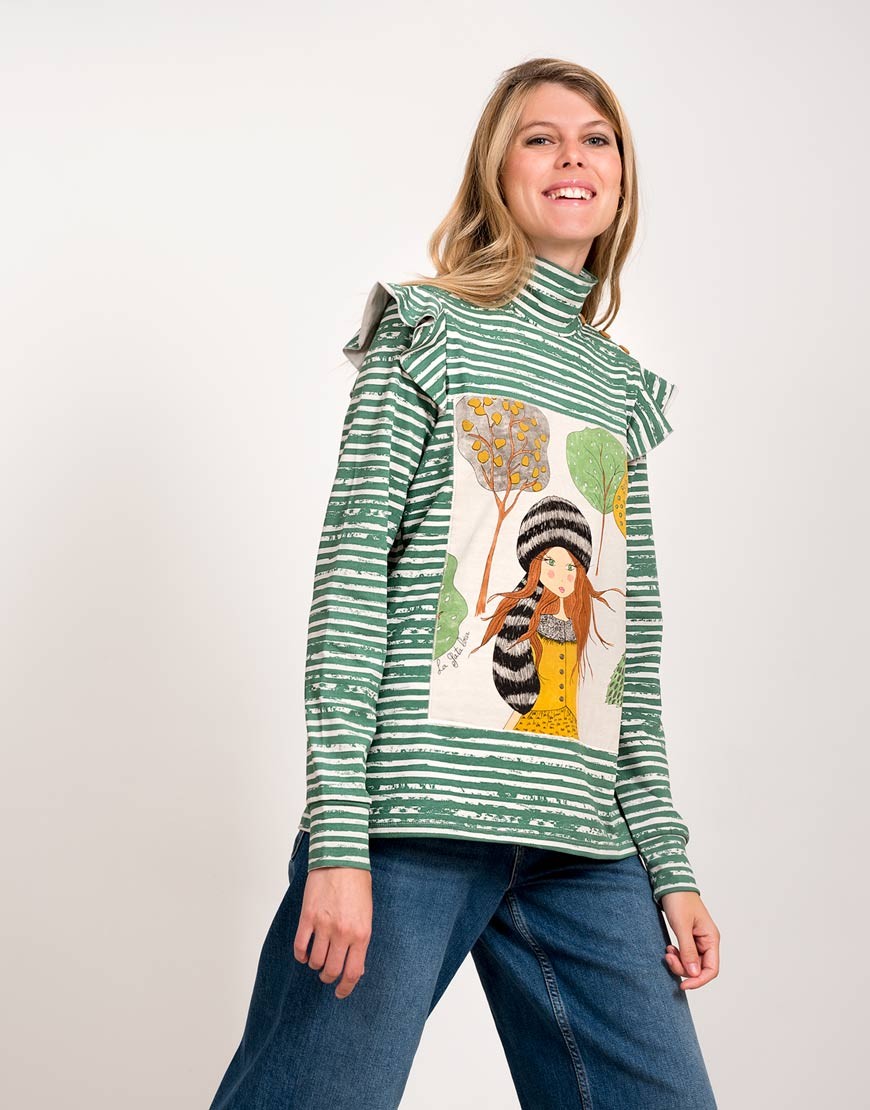 Camiseta de manga larga y cuello Perkins, abierto hasta el inicio del hombro y abotonado. Con estampado de rayas verdes tipo acuarela sobre fondo gris claro, en la parte delantera va bordada una ilustración de aire invernal, de muñeca entre árboles, en tonos mostaza, gris y verde seco. Lleva dos alitas en los hombros. Las mangas son rectas, y van rematadas con puño.