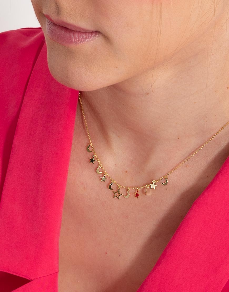 El collar Lunas y Estrellas combina sencillez y dinamismo en un diseño equilibrado. Los pequeños motivos lisos cuelgan suavemente de la cadena frontal, creando un efecto ligero y con movimiento que realza el escote sin recargarlo.