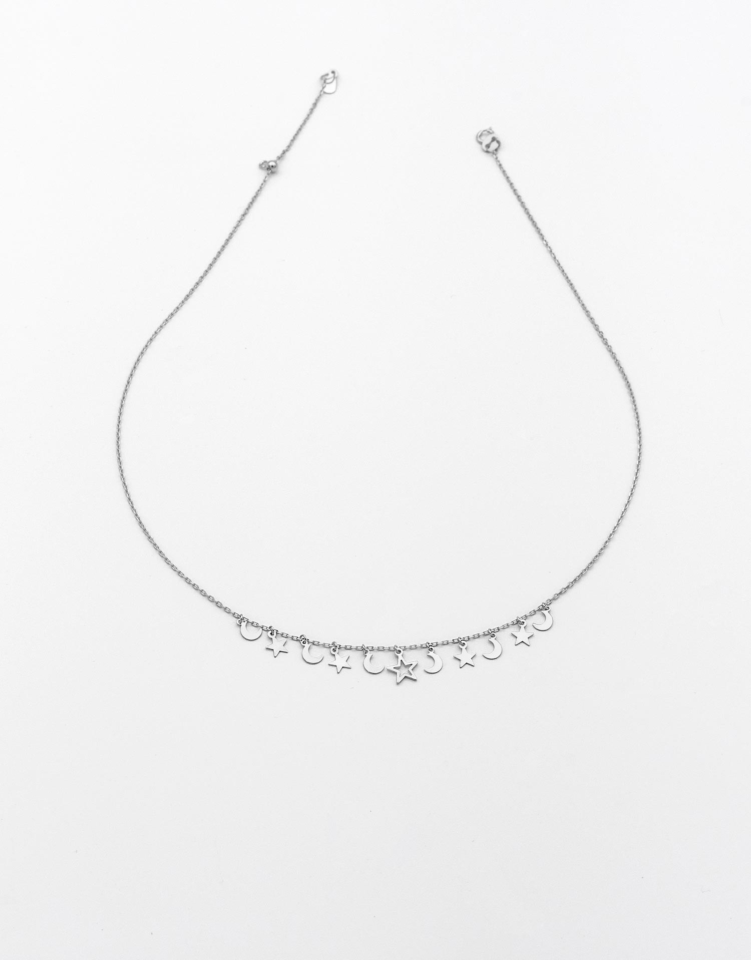 Collar de cadena fina en plata de ley 925 con pequeñas lunas y estrellas lisas distribuidas en el frontal. Su diseño ligero aporta movimiento y un acabado delicado, con cierre de reasa, cadena de extensión y bolita reguladora del largo a un ajuste adaptable.