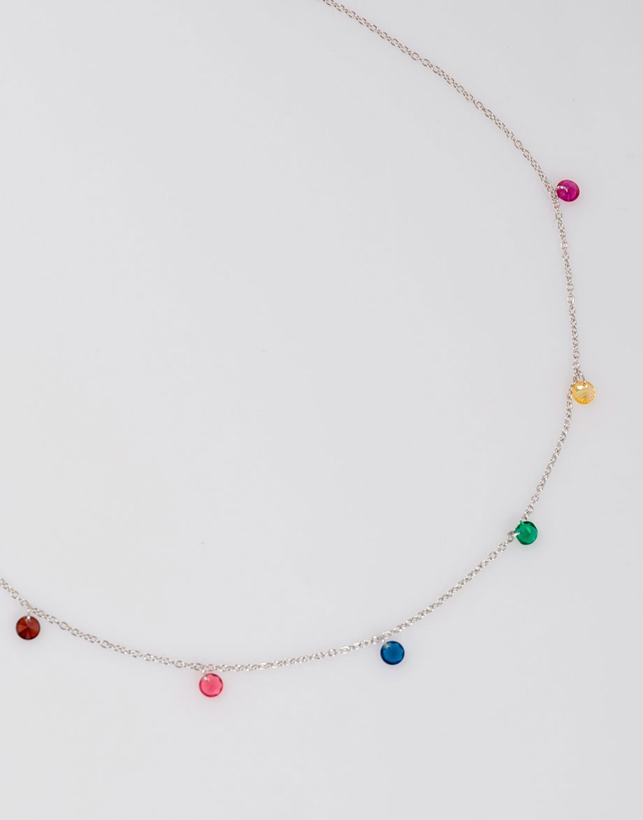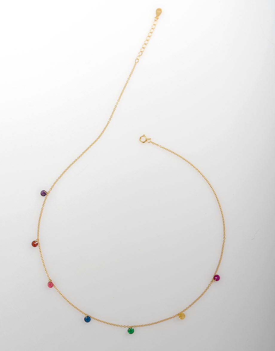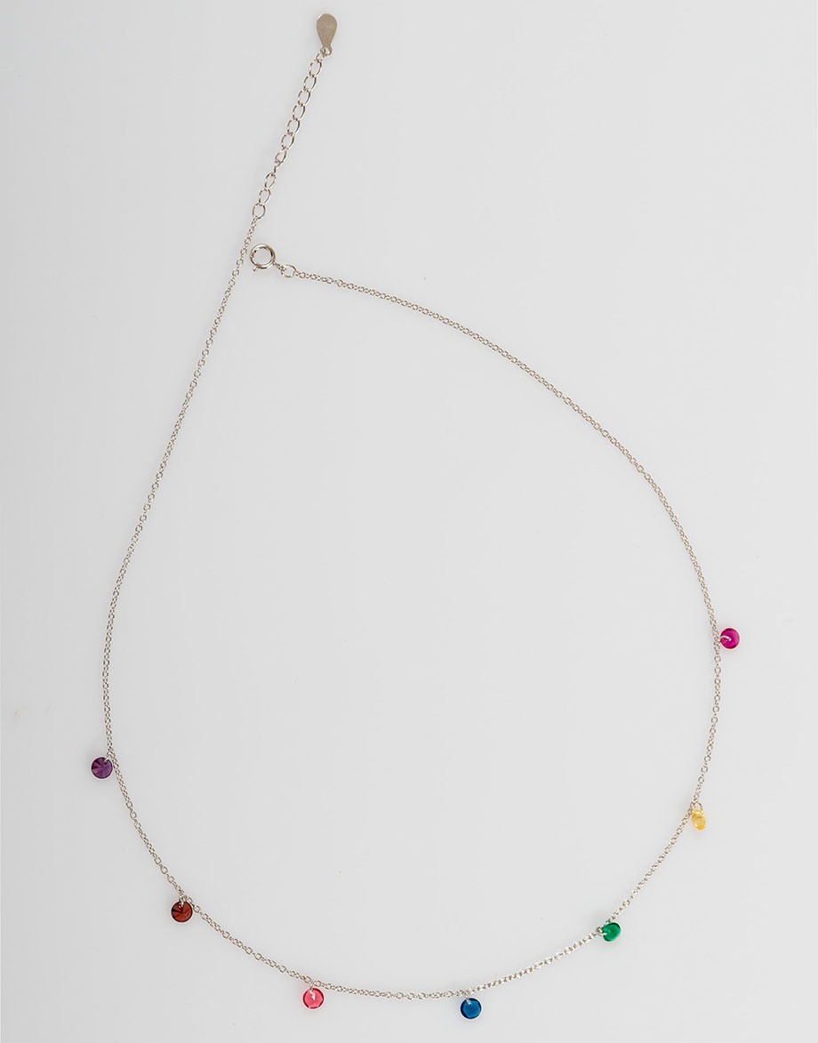 Collar en plata 925. Lleva 7 circonitas de color. El largo de la cadena es de 41 cm, extensible a varias alturas hasta 45 cm.