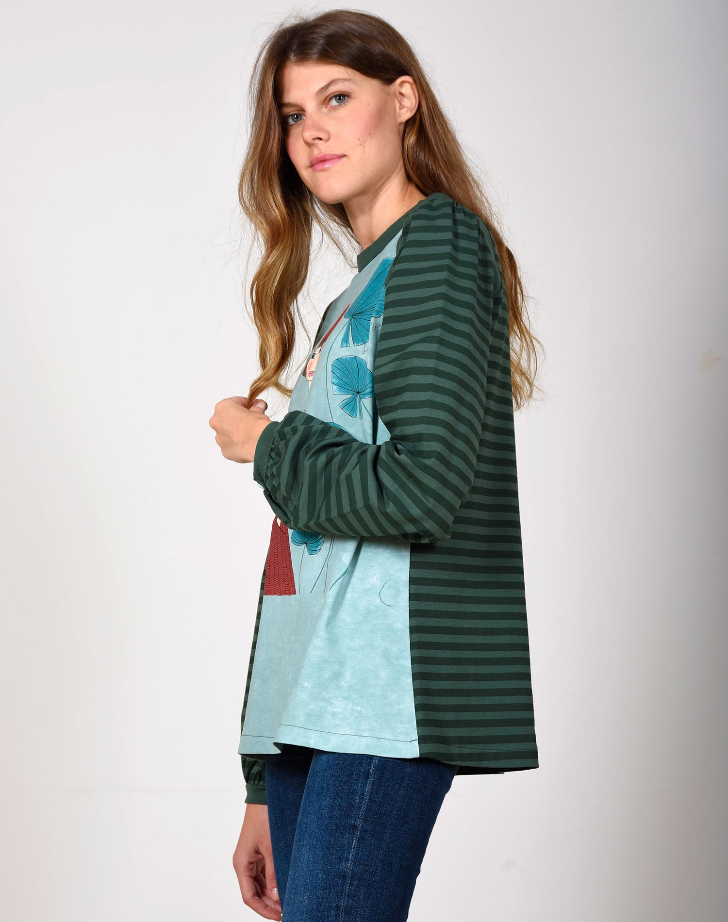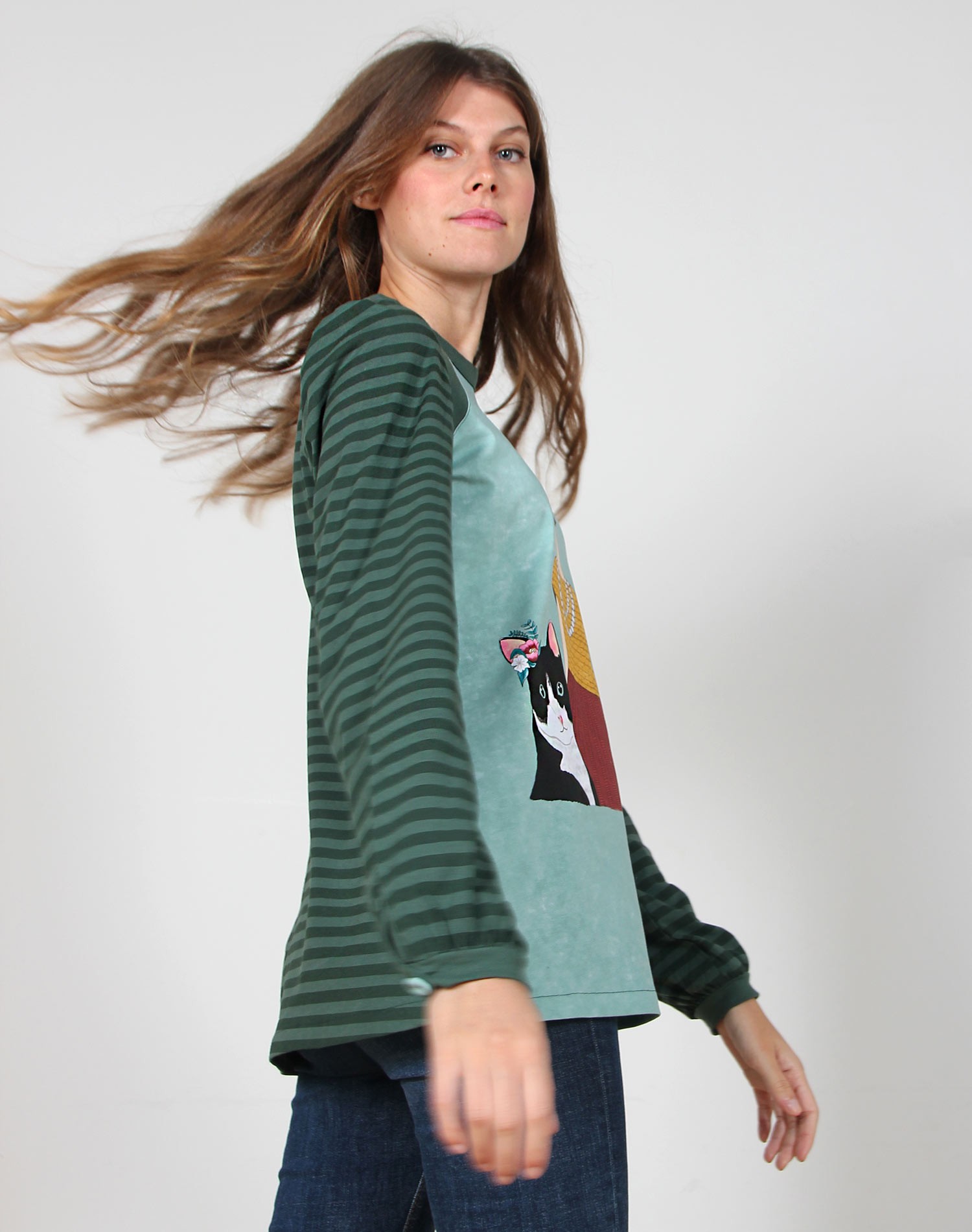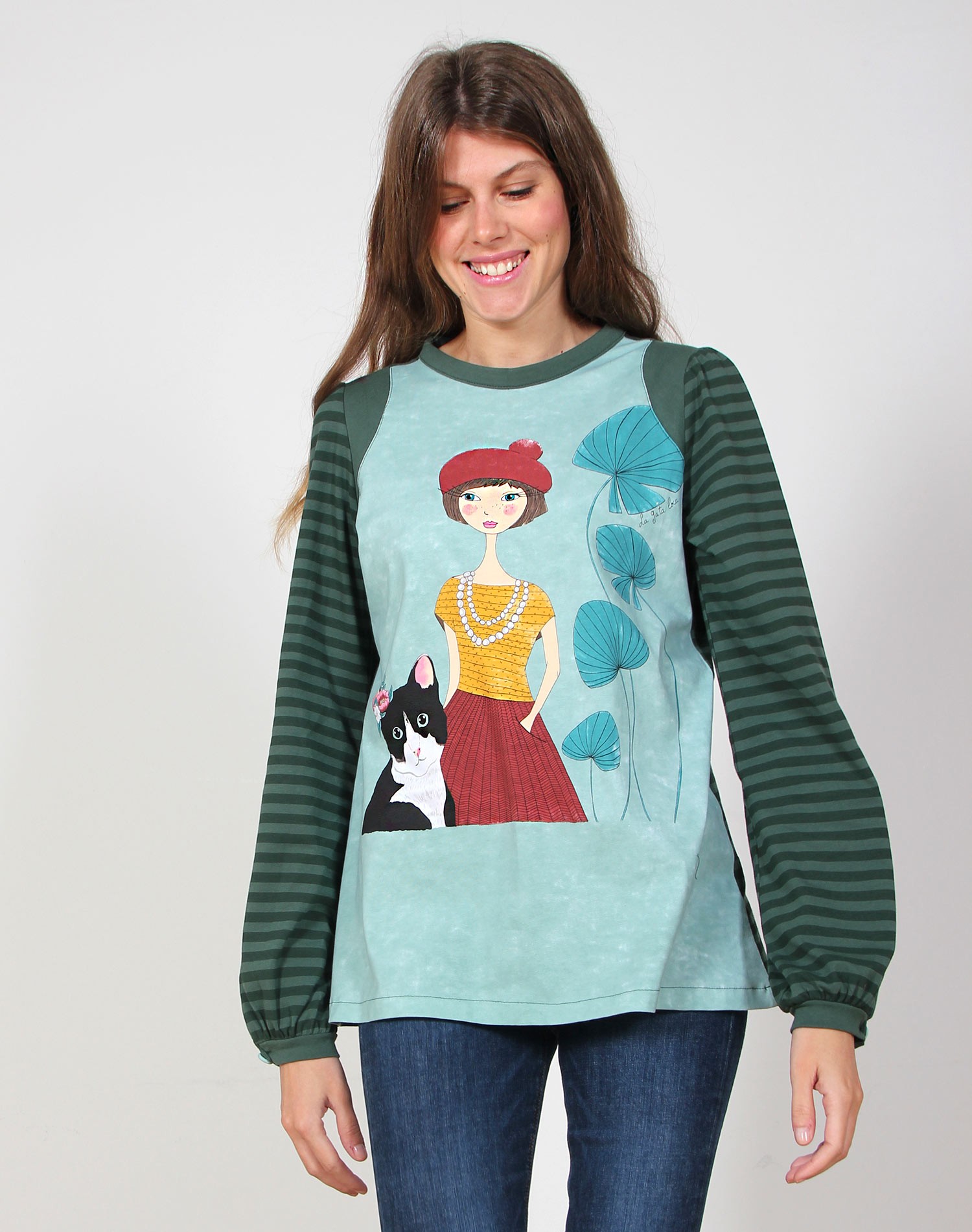 El Campo del Gato es una camiseta original con estampado de rayas en dos tonos de verde. El frente lleva una ilustración de diseño único con motivo de chica parisina y su gato, en tonos alegres e invernales,combinando verde musgo, mostaza y teja.