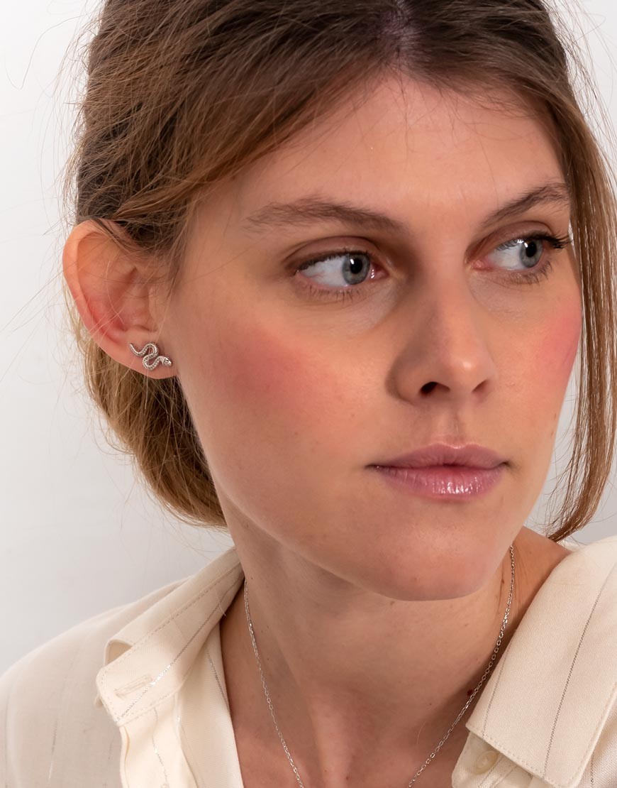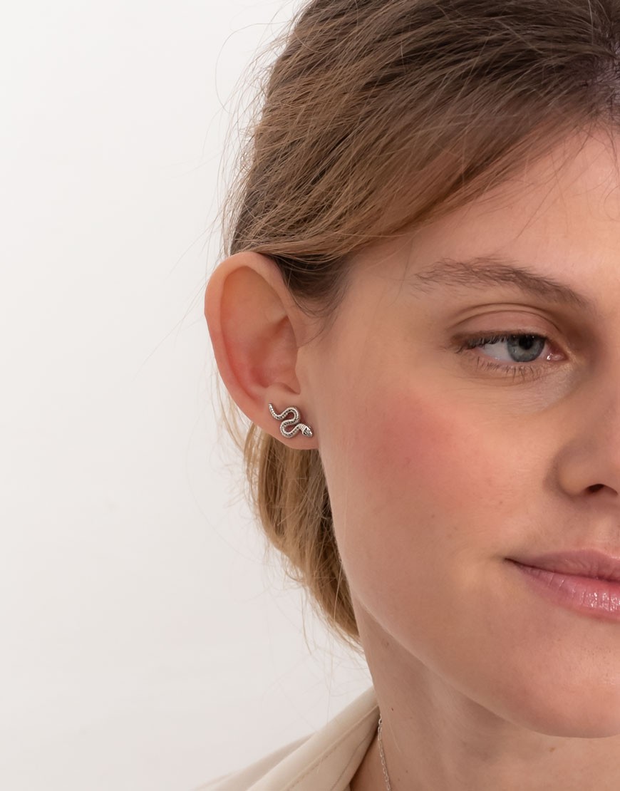 Este pendiente de serpiente de plata labrada, de diseño equilibrado y sobrio, se adapta con armonía a distintos looks: de diario y más sofisticados.